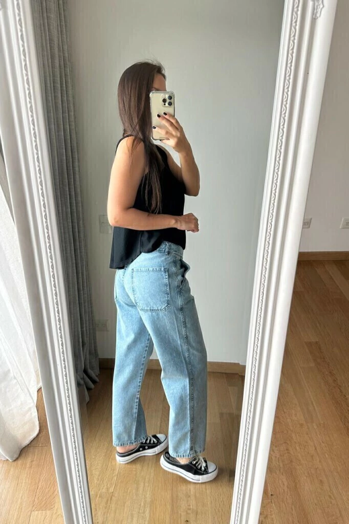 - Tela: Jean rígido, sin spandex, lo que asegura que el pantalón mantenga su forma con el tiempo.